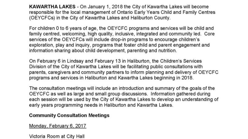 The City of Kawartha Lakes will be operating OEYCFC’s in 2018 and are holding community consultation meetings.