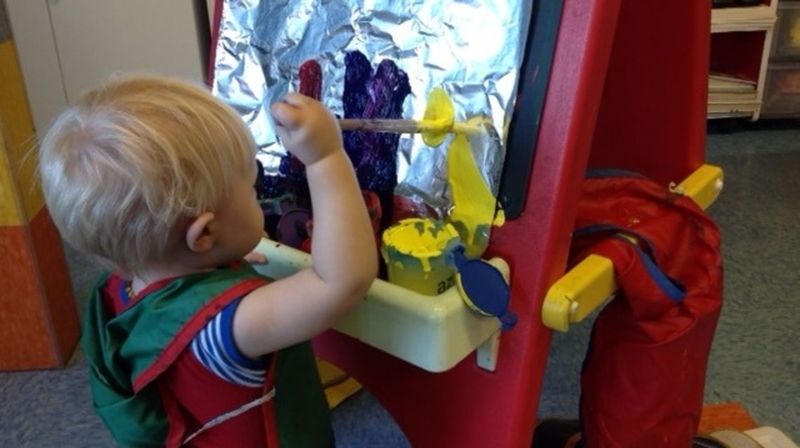 Children were having fun exploring tin foil art today at the Haliburton OEYC! Painting on tin foil gives children opportunities for sensory experiences and develops vocabulary and motor skills. Tin foil can be secured to an easel, or laid flat on a table. The tin foil can be left smooth which provides a canvas that is shiny and reflective or crinkle it up for a ‘bumpy’ canvas. Paint with paint brushes, cotton swabs, or allow children to use fingers and hands to paint with. Adding a few drops of dish soap to the paint creates a nice slippery feeling paint and aids in clean up as well. So get...